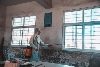 接着,队员们在朱董事长的引导下开始对员工教室和教师办公室开展消毒工作。全副武装的同学们身穿防护服、肩背消毒喷雾器,忍受着消毒剂的刺激气味,严格按照规范的消毒程序对公司楼层教室、走廊、楼梯、库室、操场、办公室、厕所等重点活动场所全面细致的消毒灭菌,不遗漏一个角落。