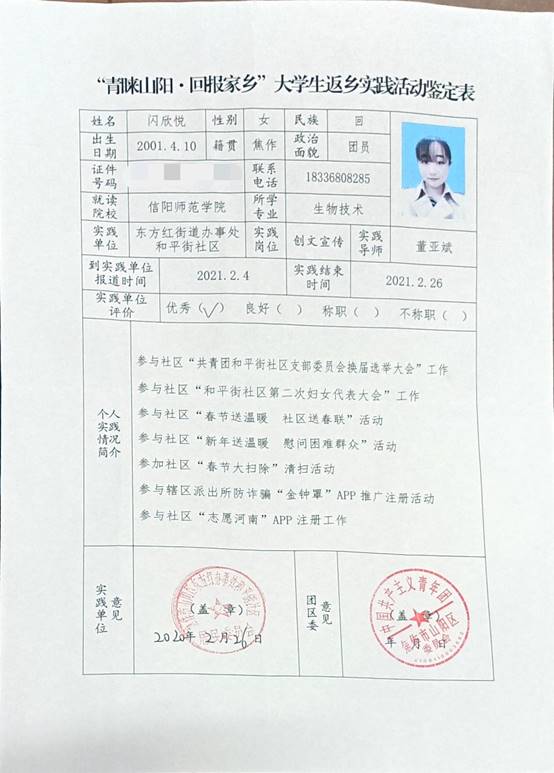 闪欣悦,河南省焦作市山阳区人,信阳师范公司太阳成tyc122cc集团2019级生物技术二班员工,任班级团支书一职,在寒假期间,新冠肺炎弥留之际,主动申请参加到焦作市山阳区东方红社区疫情防控的工作,并参与到焦作团市委的“青睐山阳,家乡”老员工寒假返乡实践暨助力疫情防控志愿服务活动。主要负责社区人员返乡登记、志愿者注册工作、为社区群众服务、推广金钟罩防诈骗系统以及宣传防控疫情知识等工作。