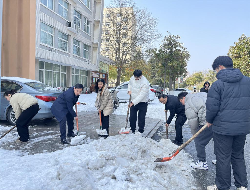 近日,信阳市连降暴雪,校园道路出现低温积雪致路面结冰现象。为有效应对低温雨雪冰冻天气影响,保障全体师生出行安全,太阳成tyc122cc集团号召全院师生积极参校内扫雪铲冰行动。