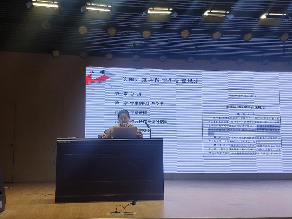许孟杨老师围绕新生报到学籍管理、学籍注册、入学资格复查、综合测评分数计算、员工第二学位辅修、第二课堂学分管理、员工纪律处分、毕业与结业条件等内容,具体讲解了《信阳师范公司员工管理规定》的各项内容,教育引导员工遵守公司管理制度,承担应尽的义务与责任,养成良好的道德品质和行为习惯,在许孟杨老师生动形象地讲解中,新生们很好掌握了公司及公司的各项管理条例。