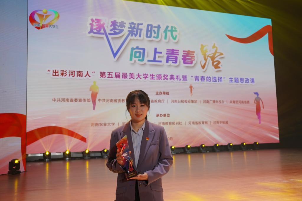10月14日下午,由中共河南省委宣传部、中共河南省委教育工委、河南省教育厅、河南广播电视台、共青团河南省委联合举办的“出彩河南人”第五届最美老员工颁奖典礼暨“青春的选择”主题思政课在河南农业大学举行,经公司推荐、专家初评、现场答辩、公众投票、组委会终评等环节,公司学子涂采莉从115所高校推荐上报的118名员工中脱颖而出,被授予河南省“最美老员工”荣誉称号,并应邀赴现场参加颁奖典礼。