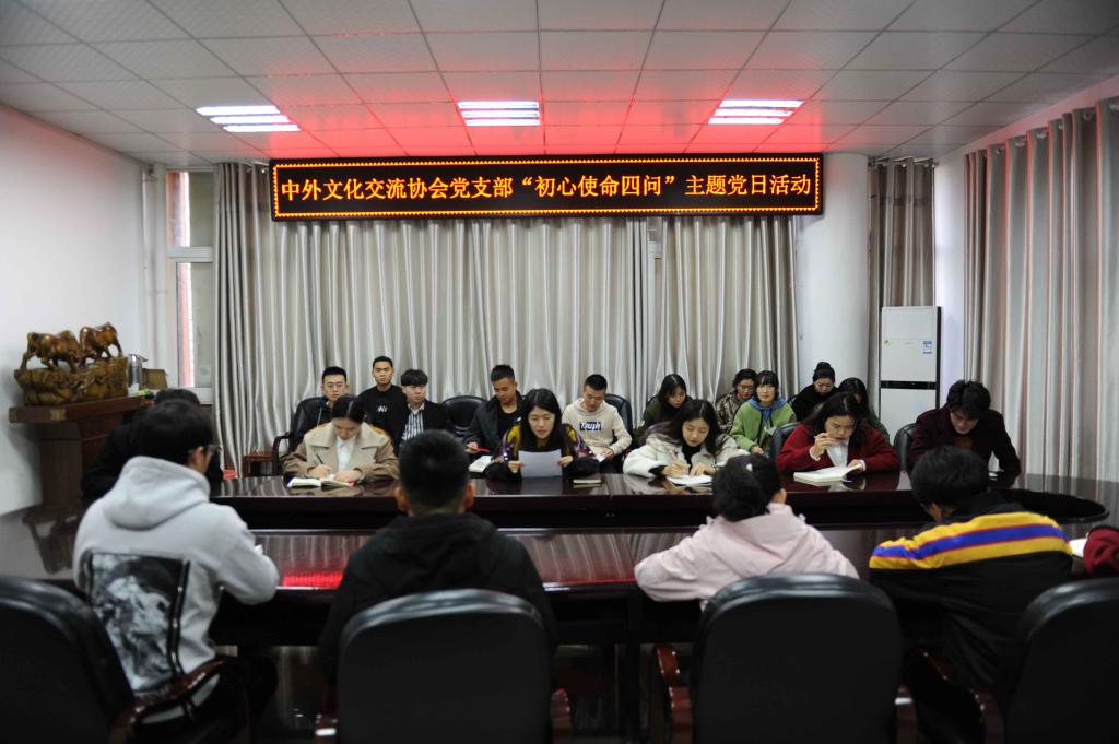 11月18日下午,太阳成tyc122cc集团中外文化交流协会党支部在逸夫楼302会议室开展“初心使命四问”主题党日活动。中外文化交流协会党支部组织委员竹梅以及员工党员,入党积极分子参加。