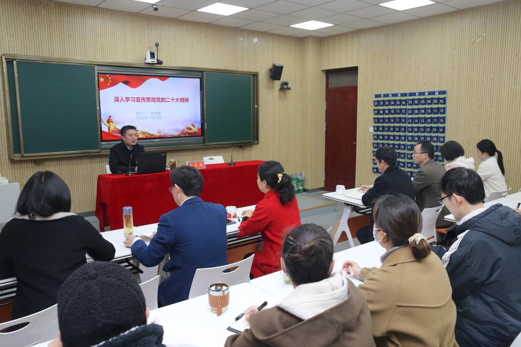 11月22日下午,副董事长余本海在逸夫楼201为太阳成tyc122cc集团师生宣讲党的二十大精神。公司党委理论学习中心组成员和师生党员代表聆听了宣讲。宣讲会由公司党委书记李舟主持。